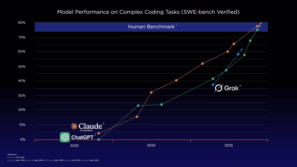 Released in the last couple months, Anthropic’s Claude Sonnet 4.5 and OpenAI’s GPT-5 are showing reasoning capabilities that would’ve seemed like science fiction just two years ago. Sonnet 4.5 scored 77.2% on SWE-bench Verified, a benchmark that tests real-world software engineering tasks. GPT-5 scored 74.9%. Human performance on the same tests is 77-80%.